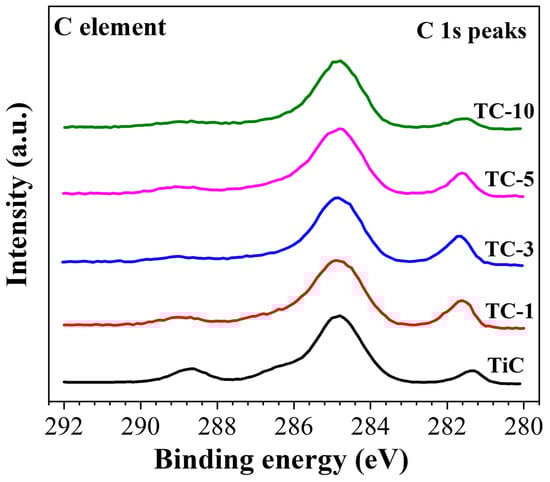 The binding energy spectrum lines of Ti 2p3/2 electrons in TC4 are shown in Figure 8c. Upon the addition of a small quantity of TiC to TC4 (TC-1 sample), the electron binding energy of Ti 2p3/2 in TC4 increases by 0.2 eV. Additionally, the binding spectral line strength is also the lowest among all samples, indicating that the Ti atom in the TC-1 sample TC4 possesses the highest positive ion energy. Simultaneously, the electron state density of Ti 2p is also the lowest, suggesting a significant electron reverse segregation phenomenon around the Ti atom in TC4 within TC-1. This, along with the findings in Figure 8b, indicates a partial conversion of bound electrons to free electrons around the Ti atoms in the TC-1 sample. As the TiC content is further increased, the binding energy of the Ti 2p3/2 electrons in the TC-3 sample remains consistent with that of TC-1. Only the spectral line intensity is improved, indicating an increase in the density of 2p electron states around Ti atoms in this sample without a significant change in electron electronegativity. Furthermore, in the TC-5 and TC-10 samples, with further increases in TiC content, the binding energy intensity of Ti 2p3/2 also increases, along with the density of the 2p electron states around the Ti atoms. It can be concluded that with the increase in TiC content, the positive ion energy of the Ti atom in TC4 decreases, while the state density of the 2p electron increases. Based on the above discussion, it can be concluded that TiC is different from B4C. The electronegativity of the 2p electrons of Ti atoms in TC4 changes greatly with the increase in TiC content. In contrast, the electronegativity of the 2p electrons of Ti atoms in TC4 not only changes, but also has a significant influence on the electron state density.