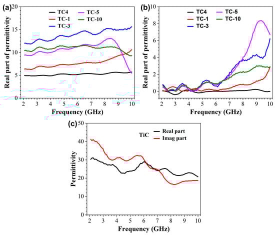 Dielectric properties of different TiC/TC4 samples at frequencies of 2~10 GHz. (a) Real part; (b) imaginary part; (c) real and imaginary parts.