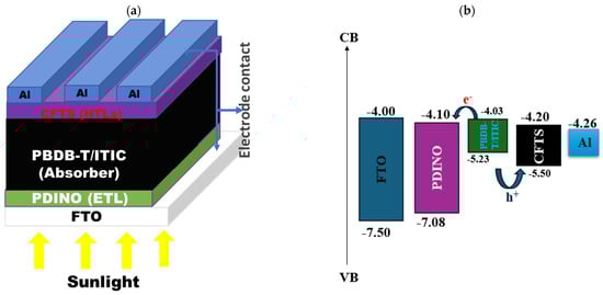 The solar cell device had the following cell configuration: FTO/PDINO/PBDB-T/ITIC/CFTS/Al. It was modeled and simulated using the SCAPS-1D software and is illustrated in Figure 1a. The device consisted of multiple stacked layers where FTO (with a Fermi level of about 0.6 eV above the conduction band minimum (CBM)) served as an anode, PDINO acted as the ETL, PBDB-T/ITIC acted as the absorber, CFTS was utilized as the HTL, and Al was used as a cathode. In the simulation, the solar spectrum was configured to the air mass 1.5 global (AM 1.5G) standard to mimic actual sunlight conditions, with a working temperature maintained at 300 K and a power density of 1000 W m−2. Figure 1b illustrates the band alignment of the various components within the device.