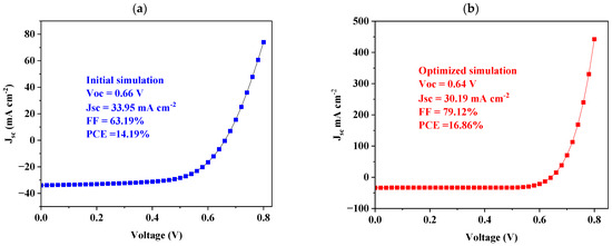 JV curves: (a) initial simulation and (b) optimized simulation.