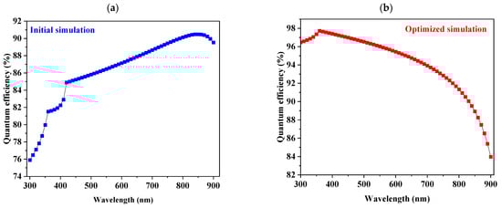 Figure 4a,b demonstrate the quantum efficiency curves for the initial and optimized simulation of the proposed solar cell, respectively. Figure 4a, the QE of the initial device, reveals a significant increase in the QE of the device from 75.90 to 90.48% between 300 and 850 nm, followed by a decline from 860 to 900 nm. The decline from 860 to 900 nm might be due to the device exhibiting strong absorption in the 300 to 850 nm range, which allows for efficient charge carrier generation, thus resulting in a higher QE. However, as the wavelength increases beyond 850 nm, the material may become less effective at absorbing light of an extended wavelength, leading to a decline in the QE. This decrease in the QE above 850 nm emphasizes how important it is to use technical techniques to increase the absorption range of solar cells. These techniques could include the adoption of multijunction cell designs to enhance performance and increase applicability in a variety of environmental conditions.