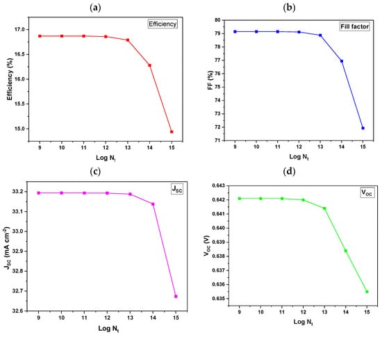 Defects can have a substantial impact on the device’s electrical characteristics and overall performance, particularly the charge carrier mobility and recombination rates [41]. Understanding the effect of defect density within the absorber layer is crucial in enhancing solar cell efficiency and stability. To determine the optimal defect density for the simulated cell, the absorber defect density was varied from 1 × 109 to 1 × 1015 cm−3, and the characteristic results are graphically presented in Figure 5. In Figure 5a, it can be noted that the PCE remained constant at 16.87% from the 9th to 12th order of density of defects levels. However, from the 13th to 14th order, the PCE slightly decreased from 16.79 to 16.28%. This was followed by a more significant decrease to 14.94% for the 15th order. The observed dip in the PCE as a function of the increasing density of defects may be attributed to the fact that as the defect density order increases, an accumulation of defects within the absorber material may result in reduced charge carrier mobility and increased recombination losses, therefore affecting the overall performance of the cell. It was also observed that the FF (Figure 5b) values of the modeled cell decreased with the increase in the defect density of the absorber. The decrease in the FF may be assigned to a high defect density, which negatively impacts charge carrier dynamics and increases the recombination of electrons and holes. Furthermore, defects within the cell trap charge carriers, thereby reducing the number of carriers available to contribute to the current. The optimal defect density of the modeled cell was at 109 cm−3, where the maximum FF of 79.15% was obtained.