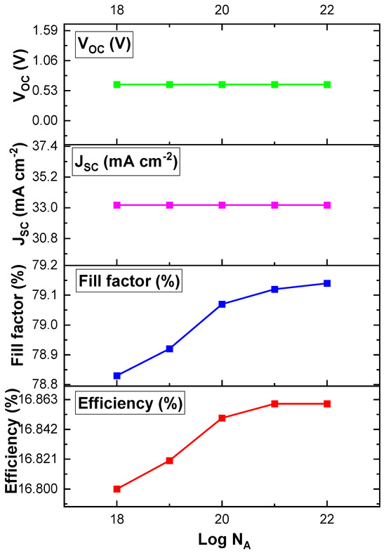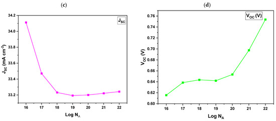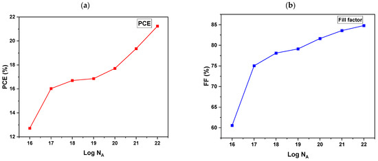The acceptor density doping level is a significant factor affecting charge transport and recombination within the cell. In the optimization of the acceptor density, the donor density was maintained at 1 × 1021 cm−3. This approach allows for a focused examination of how varying the acceptor density impacts the overall performance of the solar cell. By keeping the donor density fixed, we can distinguish the effects of acceptor doping on important parameters such as the charge carrier concentration, recombination rates, and the electric field distribution within the solar cell device. A higher acceptor density may improve the separation of photogenerated charge carriers, thus lowering the possibility of recombination, resulting in a higher PCE. Figure 7a shows that as the PCE increases, the acceptor density increases, with the 22nd order attaining the highest PCE value of 21.24%. The increase in the PCE could be due to improved charge carrier dynamics. As the acceptor density increases, the device may experience better charge collection and reduced recombination losses. This leads to higher efficiency in converting light into electricity. It was also noted that the FF (Figure 7b) increased with an increase in the acceptor density. The reason behind the increase in the FF might be the enhanced mobility of charge carriers when the acceptor density is optimized, enabling their transport to the appropriate electrodes, therefore increasing the FF.