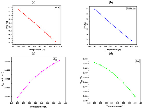 The ambient temperature has a considerable impact on the performance of a photovoltaic device, influencing various aspects of its operation and performance [36]. The numerical simulation of the solar cell devices examined in this work was performed at a temperature of 300 K. However, to further understand the performance characteristics, simulations were also carried out from 240 to 400 K to investigate the impact on the cell’s output characteristics. This method enables us to evaluate how different thermal conditions affect the efficiency and operation of solar cells, providing crucial insights into their operational stability and performance across a wide range of ambient temperatures. At the initial temperature of 240 K, the device did not exhibit any photovoltaic behavior. Hence, to explore the impact of temperature on the absorber’s performance, the temperature was subsequently varied from 260 to 400 K. The main reason for simulating these cells over this temperature range was to ensure their reliable performance in diverse environmental conditions. Figure 8 shows the results of the photovoltaic parameters at different operating temperatures.