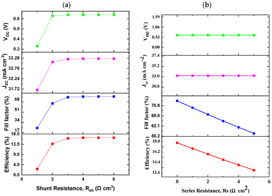 (a) Impact of series resistance and (b) shunt resistance on VOC, JSC, FF, and efficiency.