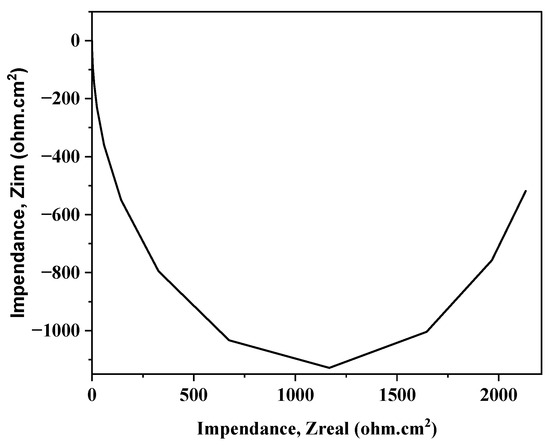 The impedance spectrum (Nyquist plot) of the model cell device was analyzed displaying the complex plane plot (Z imaginary versus Z real), as demonstrated in Figure 10. The curve has a pronounced U shape, as commonly observed in Nyquist plots, which is associated with the charge transfer mechanism within the solar cell, which depicts the interactions between electrons and ions at the interface of the electrolyte and the electrode. In the lower frequency range, diffusion processes dominate the resistance, resulting in the ascending arm of the U, whereas at higher frequencies, the descending arm of the U represents charge transfer resistance. The U-shaped impedance profile offers unique insights into the kinetic processes that occur within the solar cell device. The analysis of the Nyquist plot revealed that as the Z real value increased from 0 to 1166.69 ohm.cm2, the Z imaginary decreased, after which it increased again. The decrease in the Z imaginary suggests enhanced charge transport and lower resistive losses within the cell. The subsequent increase in the Z imaginary at higher Z real values may possibly be due to charge accumulation effects or slower dynamic processes within the device. This behavior underscores the complex interactions between charge transport, recombination, and other factors affecting the overall performance of the solar cell.