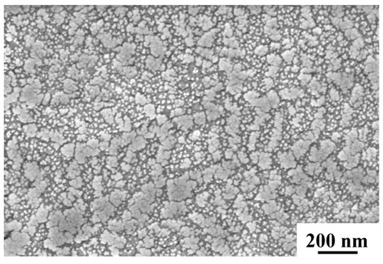 The capillary crystalline material used in this study was a commercially available inorganic aqueous nano-ion capillary crystalline material (Capillary Crystalline, CC). This material is an alkaline, low-viscosity, low-surface-tension aqueous solution containing nanoparticles with diameters ranging from 3 to 45 nm and composed primarily of silicate. When encountering water, it can dissolve into an ionic state, and react with hydration products in mortar to fill pores. Figure 1 presents the SEM morphology of the nano-ion capillary crystalline material. For clear observation, the solution was evenly coated onto a copper-based conductive adhesive to form a uniform thin film, which was allowed to dry naturally at room temperature and subsequently sputtered with gold for analysis. The SEM images reveal that after drying, some nanoparticles in the crystallization material exhibited aggregation. Mortar samples were immersed in the capillary crystalline material for 1 h, followed by standard curing for 28 days.
