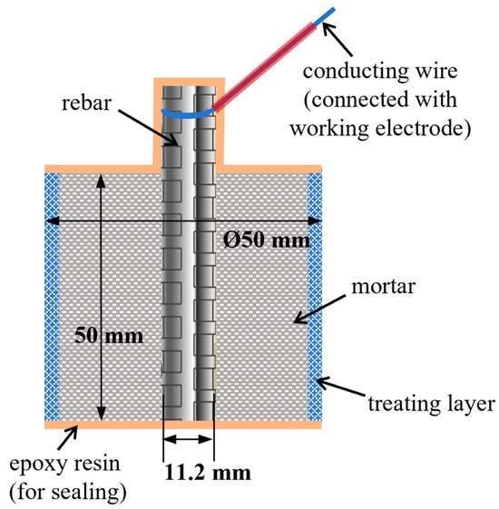 HRB400 steel rebars with diameters of 11.2 mm were embedded in fresh mortar and cured under standard conditions to prepare Ø50 mm × 50 mm mortar-rebar specimens. Both ends of the cylindrical specimens were sealed with epoxy resin, leaving the cylindrical side surface exposed for corrosion-resistant treatment and electrochemical testing. A conducting wire connected to the rebar was led out from one end of the specimen, to ensure electrical contact to the working electrode. The areas of mortar and rebar exposed to the electrolyte were 7.85 × 103 mm2 and 1.76 × 103 mm2, respectively. The schematic diagram of the mortar-rebar specimen is shown in Figure 2. The corrosion-resistant treatment and curing processes were performed according to Table 3 previously described in Section 2.2.3.
