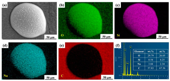 EDS mapping of nano-ion capillary crystalline materials: (a) SEM morphology; (b) O distribution; (c) Si distribution; (d) Na distribution; (e) C distribution; (f) elemental ratios from EDS mapping.