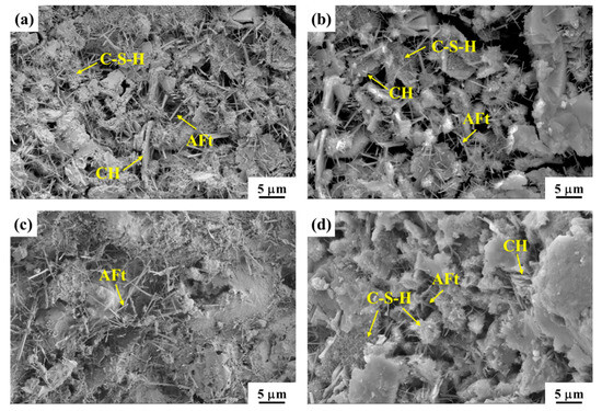 The SEM images of mortar hydration products subjected to various treatments are shown in Figure 4. The hydration products in untreated mortar (Figure 4a) include plate-like calcium hydroxide (CH), fibrous C-S-H gels, and rod-shaped AFt ettringite (3CaO·Al2O3·3SO3·32H2O) crystals. These hydration phases are interspersed with noticeable voids, reflecting the porous nature of the mortar matrix. Mortar treated with nano-ion capillary crystalline (Figure 4b) exhibits a denser microstructure. The treatment effectively fills a significant portion of the voids and initiates chemical reactions between the capillary crystalline materials and the cement paste, resulting in the formation of denser C-S-H gels. This process reduces porosity and enhances the structural compactness of the mortar. Mortar treated solely with silane (Figure 4c) displays a smoother surface with a modest decrease in porosity. The silane forms a hydrophobic layer on the surface, which contributes to a reduction in surface-connected pores. The mortar subjected to the combined treatment (Figure 4d) demonstrates the most compact microstructure. The synergy of the nano-ion capillary crystalline and silane effectively fills internal voids and creates a dense hydrophobic protective film on the surface. This dual treatment significantly increases the content of C-S-H gels while reducing the proportion of AFt crystals, further improving the integrity and durability of the mortar matrix.