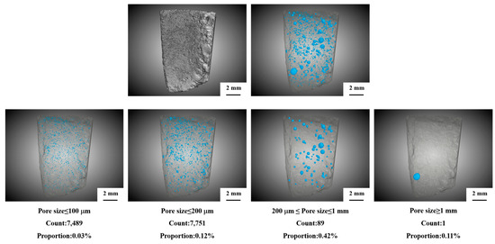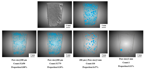 Figure 5 and Figure 6 present the in-situ X-CT scanning results of the same mortar samples before and after the nano-ion capillary crystalline treatment. In these images, the blue regions represent the internal pore structures of the mortar. Although the position of the pores is identical, the proportions of the pores changed. The results demonstrate that nano-ion capillary crystalline treatment significantly reduces internal porosity, particularly in micropores smaller than 100 μm, where the pore volume proportion decreases from 0.08% in untreated samples to 0.03% after treatment. For pores ≤ 200 μm, the proportion also decreases substantially, from 0.18% to 0.12%, indicating a significant blocking effect on small pores by the nano-ion capillary crystalline treatment. Additionally, pores ranging from 200 μm to 1 mm exhibit a moderate reduction, with the proportion decreasing from 0.47% in untreated samples to 0.42% after treatment, while no proportion change can be observed for pores with sizes larger than 1 mm after treatment, indicating that the blocking effect on larger pores is not significant. Micropores in mortar originate from the intrinsic porosity of cement hydration products. These interconnected fine pores serve as primary pathways for the transport of moisture and chloride ions, which act as corrosive agents. Following nano-ion capillary crystalline treatment, a secondary hydration reaction occurs between the crystallization material and free calcium ions within the micropores, resulting in the formation of hydration products such as C-S-H. These products fill the pore structure, achieving a densification effect. In contrast, the volume of macropores (larger than 1 mm) shows minimal change after treatment. Macropores primarily arise from entrapped air during cement hydration and remain isolated. These isolated pores have a lesser impact on the transport of moisture and chloride ions compared to interconnected micropores. Consequently, the effect of nano-ion capillary crystalline on macropores is limited. This limitation arises because macropores lack sufficient free calcium ions, and reactions are confined to the pore edges, causing slight reductions in pore size but leaving the overall macropore structure largely unchanged.