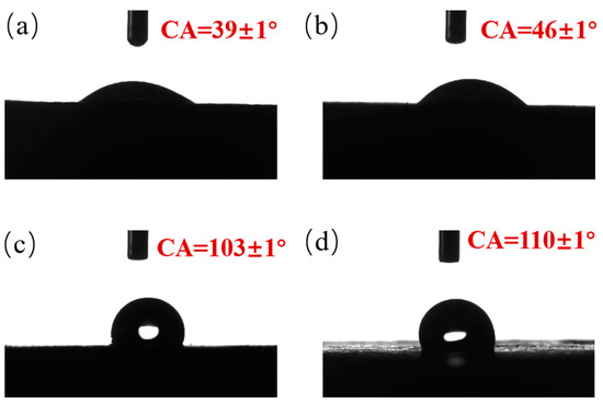 Surface contact angles of mortar samples with different treatments: (a) untreated mortar surface; (b) mortar surface treated with nano-ion capillary crystalline; (c) mortar surface treated with silane; (d) mortar surface treated with a combined nano-ion capillary crystalline-silane treatment.