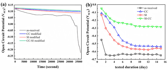 OCP tests of mortar-rebar samples with different treatments: (a) OCP curves of samples tested within the first 10 h of immersion; (b) OCP values of samples tested over 15 days of immersion.
