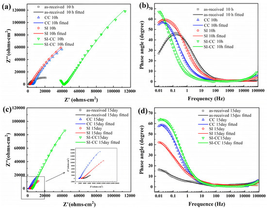 EIS of mortar-rebar samples after immersion for 10 h and 15 days in 3.5% NaCl solution: (a) Nyquist plot after 10 h of immersion; (b) Bode plot after 10 h of immersion; (c) Nyquist plot after 15 days of immersion; (d) Bode plot after 15 days of immersion.