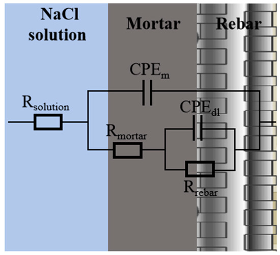 The EIS data of samples after being immersed in 3.5% NaCl solution for 15 days were fitted using the R(Q(R(QR)))W circuit to obtain the parameters. The schematic diagram of the circuit is shown in Figure 11. In this circuit, the resistances (R) represent the solution resistance (Rsolution), mortar resistance (Rmortar), and rebar resistance (Rrebar), respectively. CPEm and CPEdl represent the capacitance of mortar and rebar interface, respectively. W is the Warburg impedance, for the correction of the passivation system of rebar and improving the fitting accuracy. The fitting results, shown in Figure 12, indicate that with an increase in immersion time, the Rmortar (Figure 12a) and Rrebar (Figure 12b) of all samples decrease. The Rrebar of the untreated sample and the samples treated with silane or ano-ion capillary crystalline drop sharply within 5 days, while the Rrebar of the nano-ion capillary crystalline-silane composite treated sample has the minimum decreasing slope. Throughout the test period, the order of the Rmortar and Rrebar values is as follows: untreated ≤ silane treated ≤ nano-ion capillary crystalline treated ≤ nano-ion capillary crystalline-silane composite treated. Furthermore, the samples treated with the nano-ion capillary crystalline-silane composite treatment consistently maintain higher levels of Rmortar and Rrebar. This result is consistent with the differences in the capacitive arc radius and phase angle peak values observed in the EIS data, and it demonstrates that the nano-ion capillary crystalline and silane composite treatment effectively improves the chloride ion penetration resistance and corrosion protection performance of the mortar-rebar samples.