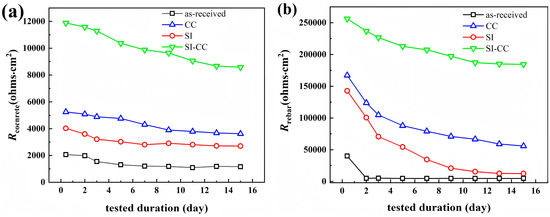 Fitting results of the EIS data for mortar-rebar samples after 15 days of immersion in 3.5% NaCl solution using the R(Q(R(QR)))W circuit: (a) mortar resistance (Rmortar); (b) rebar resistance (Rrebar).