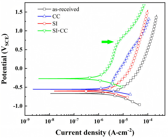 The open circuit potential (OCP) was monitored continuously during the initial 10 h of immersion to capture the early-stage corrosion behavior, followed by periodic measurements during long-term testing to obtain the stable OCP value. Electrochemical impedance spectroscopy (EIS) was performed periodically throughout the test. Measurements were initiated at the OCP, with an applied perturbation of ±10 mV and a frequency range of 0.01–10,000 Hz. Potentiodynamic polarization (PDP) tests were conducted after the long-term corrosion test. The applied voltage started at 0.25 V below the OCP and was increased to 1 V at a scan rate of 1 mV/s.