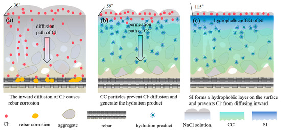 Mechanism of chloride ion ingress and corrosion protection for mortar-rebar samples under different treatments: (a) untreated mortar-reinforced samples; (b) mortar-reinforced samples treated with nano-ion capillary crystalline; (c) mortar-reinforced samples treated with nano-ion capillary crystalline and silane composite treatment.