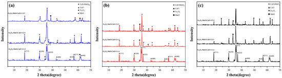 (a) XRD patterns of samples with Fe2O3 molar ratios of 1, 1/2, and 1/3. (b) XRD patterns of samples with MnO molar ratios of 1, 1/2, and 1/3. (c) XRD patterns of samples with CuO molar ratios of 1, 1/2, and 1/3.