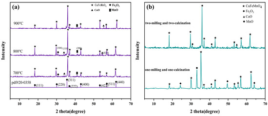 (a) XRD patterns of samples calcined at 700 °C, 800 °C, and 900 °C using the optimal ratio. (b) XRD of samples synthesized by the two-milling and two-calcination method versus the one-milling and one-calcination method.