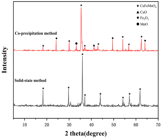 Figure 3 shows the XRD patterns of samples synthesized using the solid-state method and the co-precipitation method, both at the optimal material molar ratio. In the figure, for the sample synthesized using the solid-state method at the optimal ratio, the diffraction peaks of the CuFeMnO4 crystalline phase are intense, with minimal or absent Fe2O3 and CuO crystalline phases, indicating that the CuFeMnO4 powder prepared using this material molar ratio is relatively pure. For the sample synthesized using the co-precipitation method, although the CuFeMnO4 crystalline phase diffraction peaks are also intense, they are accompanied by a significant amount of impurity phases. This is because the reaction conditions of the co-precipitation method (temperature, pH, and precipitant concentration) significantly influence the purity of the product. Failure to strictly control these conditions can result in the appearance of impurity phases. Furthermore, the interactions between Fe3+, Mn2+, and Cu2+ ions can lead to different precipitation rates for each metal ion, impacting the final product purity [26].