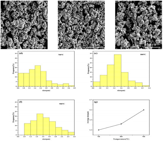 SEM images of samples at different secondary calcination temperatures: (a) 700 °C, (b) 800 °C, (c) 900 °C; nanoparticle size distribution histogram: (d) 700 °C, (e) 800 °C, (f) 900 °C; (g) nanoparticle average size.