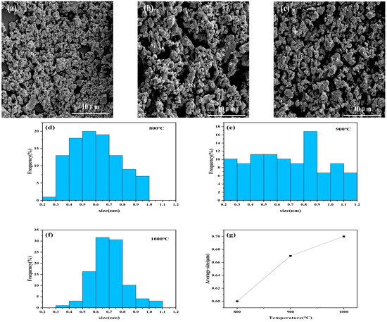 SEM images of samples at different secondary calcination temperatures: (a) 800 °C, (b) 900 °C, (c) 1000 °C; nanoparticle size distribution histogram: (d) 800 °C, (e) 900 °C, (f) 1000 °C; (g) nanoparticle average size.
