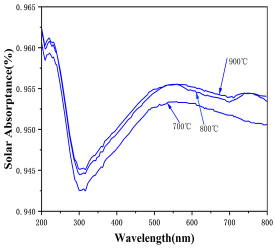 In the ultraviolet region (200–400 nm), the absorbance of the three samples shows minimal differences, and all curves exhibit a decrease in absorbance around 300 nm. This is likely due to electronic transitions or changes in material properties that affect the ultraviolet absorption. In the visible region (400–700 nm), the absorbances of the samples calcined at 900 °C and 800 °C are similar, remaining stable at around 95.5%–96%, with the former being slightly higher than the latter. The absorbance of the sample calcined at 700 °C is significantly lower than that of the samples calcined at 800 °C and 900 °C. This indicates that higher annealing temperatures enhance the absorption of visible light. In the near-infrared region (above 700 nm), the curves begin to converge, indicating a reduced influence of temperature on the absorbance in this range. This is because higher annealing temperatures (800 °C and 900 °C) increase the crystallinity, while lower temperatures result in less complete crystal growth, leading to scattering of light and reduced absorption. Also, higher annealing temperatures may increase the grain size, thus leading to higher absorption [28].