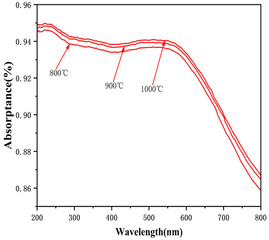 As can be seen from the figure, the absorbance increases with increasing annealing temperature. The sample calcined at 1000 °C exhibits the highest absorbance throughout the entire spectrum, followed by the 900 °C and 800 °C samples. All samples show high absorbance (94%–95%) at lower wavelengths (200–400 nm). However, as the wavelength increases, the absorbance gradually decreases, and the differences between the samples with different calcination temperatures become more pronounced, especially above 500 nm.