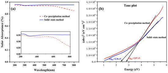 (a) Comparison of absorbance spectra for samples synthesized by the solid-state method and the co-precipitation method. (b) Tauc plot of the direct band gap energy for samples synthesized by the solid-state method and the co-precipitation method.
