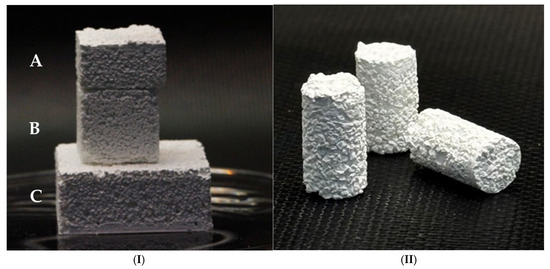 (I) Nanosynt Block in its three versions of dimensional forms. In A: 05 × 10 × 10 mm, B: 10 × 10 × 10 mm, and C: 08 × 20 × 20 mm. (II) Samples for Micro-CT.