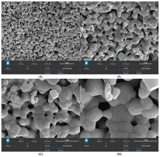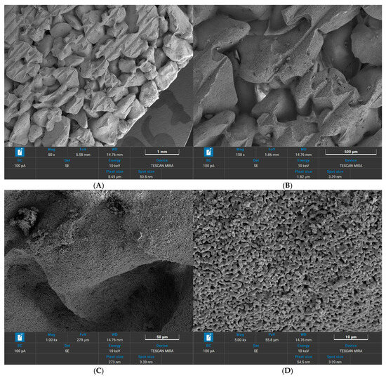 SEM images at various magnifications revealed the surface morphology of the Nanosynt Block. At low magnifications (Figure 3A–D), a uniform distribution of pores was observed, while at and high magnifications (Figure 3E–H), details of pore morphology and interconnection were visualized.