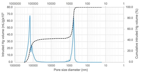 Mercure intrusion curve. The graph shows the volume of mercury intruded (mL/g × 103) as a function of pore diameter (nm), representing the pore size distribution. The dashed line indicates the cumulative volume of mercury intrusion (%) relative to pore diameter.