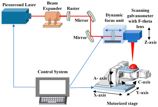 The processing device used in this experiment was independently developed by our research group and is shown in Figure 1. The system comprises a picosecond laser, an optical system, and a displacement-rotation platform. A picosecond laser (EdgeWave, Aachen, Germany) operating at a wavelength of 532 nm and a pulse width of 10 ps was employed. The optical system includes a beam expander, a grating, a reflector, and a three-dimensional galvanometer. When emitted, the laser beam undergoes initial expansion before being directed to the beam expander. The expanded beam then traverses two sequential mirrors before reaching the 3D galvanometer at the terminal optical path. The 3D galvanometer comprises a dynamic focusing unit and a 2D galvanometer, which is equipped with an F-theta lens at its base. This system focuses on the laser beam, producing a high-quality Gaussian spot with a 45 μm diameter on the workpiece surface. The workpiece is mounted on a displacement-rotation stage to allow precise positional adjustments. Precise laser processing control is achieved using laboratory-developed computer software, which regulates the movement of the displacement-rotation platform and sets parameters such as scanning speed, frequency, and number of scans. This software is built upon the laboratory’s proprietary LR-EMC laser motion control card and is used exclusively for in-house experiments.