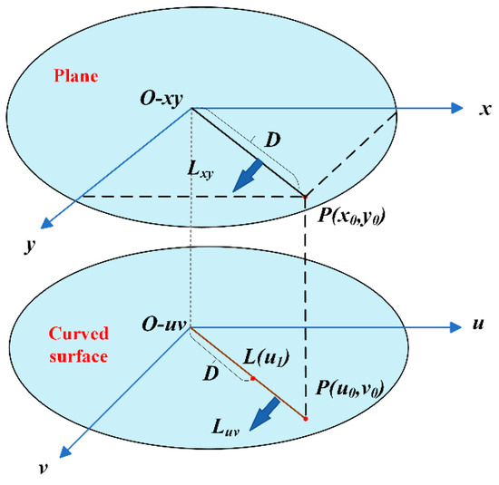 Conventional methods for mapping structural patterns onto surfaces typically employ direct projection (DP), akin to the principle of a parallel light beam propagating along the Z-axis, forming a projection of the pattern onto the surface. This method generates the micro-structural pattern on the surface by directly mapping the two-dimensional coordinate system to the Z-axis. However, this method is prone to significant distortion of the micro-structure on the surface. Therefore, a curve-guided surface projection processing method is necessary to mitigate the distortion. The schematic of this method is illustrated in Figure 2. First, the center of the enclosing box is chosen as a reference point within the pattern structure, and a Cartesian coordinate system is established at this point, denoted as O-xy. Subsequently, the reference point is projected onto the complex surface to obtain the point O-uv, which defines the parametric coordinate system. Next, discretize the micro-structural pattern into several discrete points and compute the Cartesian coordinate distance D between any discrete point P(x0, y0) in the pattern and the reference point O-xy. Then, project the point P onto P(u0, v0), ensuring that the line segment Lxy is mapped onto the curve Luv. Finally, find a point L(u1) on the curve such that the length of the arc from O-uv equals D, and adjust the point P(u0, v0) to L(u1).