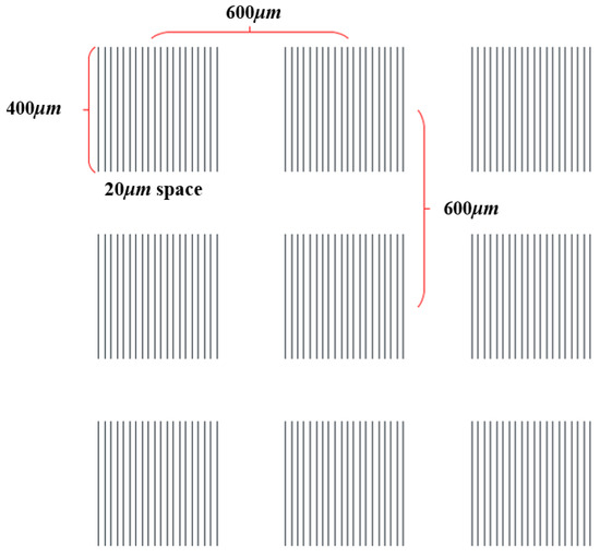 After investigating the effect of the laser incidence angle on groove properties, the limiting range was determined to be 11°, and the plane was tilted using a rotating table to simulate non-perpendicular laser incidence. A micro-dimple pattern was designed, as shown in Figure 3, consisting of nine identical regions with 600 μm spacing. Each region features line segments with lengths of 400 μm and spacings of 20 μm, with the laser scanning along each line segment sequentially. The laser scanned along each line segment in turn, with patterns projected onto the inclined plane at 10° and 14° using CGSP and DP methods, respectively. Patterns were also processed on a plane with a 0° inclination angle, serving as the control group (i.e., laser incidence angles of 0°, 10°, and 14°, respectively). The specific experimental parameters are provided in Table 2.