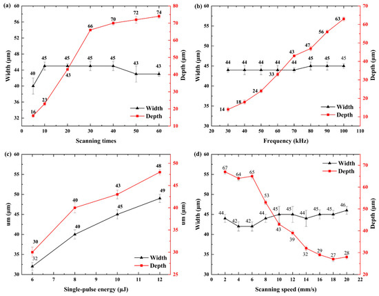 Effect of laser parameters on groove depth and width: (a) scanning times; (b) frequency; (c) single-pulse energy; (d) scanning speed.