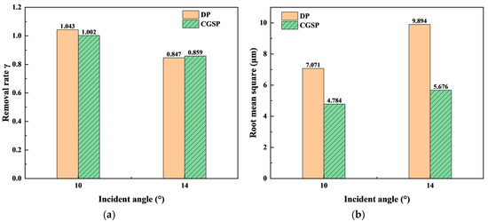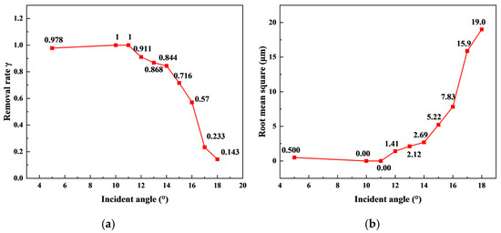 Influence of varying incidence angles on the trench removal rate and root mean square effect: (a) removal rate; (b) root mean square.