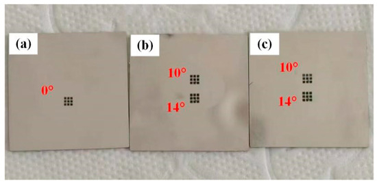Figure 9 illustrates the physical results of micro-dimple machining using a stainless steel flat plate simulating an inclined plane. Figure 9a shows the physical image of the micro-dimples processed at an inclination angle of 0 degrees, while Figure 9b,c show the physical images of the micro-dimples processed by the CGSP method and the direct projection method, respectively. Theoretically, the machining method proposed in this paper has less error in the structure and more closely resembles the machining situation on a flat surface compared to the direct projection method, but due to the limitation of the camera resolution and the surface reflection of the stainless steel material, the relevant differences are not easy to be distinguished by the naked eye. Specific differences will be shown in the microscopic images later on.