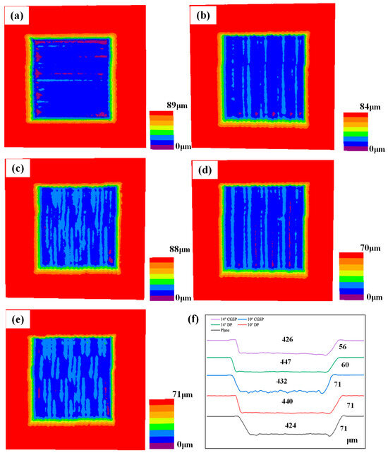 Morphological results of the micro-dimples on an inclined plane: (a) planar control, (b) 10° DP, (c) 10° CGSP, (d) 14° DP, (e) 14° CGSP, (f) cross-sectional profiles of various methods at different angles and their depth and width. The color scale indicates that different colors correspond to varying heights, with the numerical values expressed in micrometers.