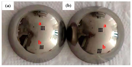 As shown in Figure 12, the actual images of spherical surfaces processed using different methods at various positions are presented. Figure 12a shows the spherical surface processed using the CGSP method, while Figure 12b shows the spherical surface processed using the direct projection method. At position a, there is no significant difference in the micro-structural morphology obtained by the two methods. This is because within the localized central region of the sphere, the angle between the surface normal and the projection direction is relatively small, resulting in a minimal distortion from the direct projection method, which is difficult to detect with the naked eye. At position b, a significant shape deformation is clearly observed in the micro-dimples processed using the direct projection method. This occurs because at position b, the angle between the surface normal and the projection direction is much larger. However, after applying the CGSP method, the shape deformation is significantly reduced.