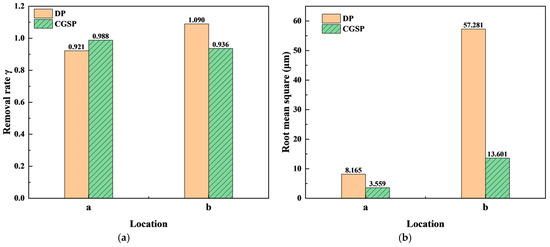 Removal rates and root mean square values for various methods at different locations: (a) removal rate; (b) root mean square.