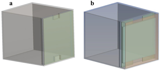 The ANSYS Fluent 19.2 software was employed to conduct numerical simulations. Figure 2 shows numerical models of the traditional and new PCM Trombe walls. The dimensions of the Trombe wall were the same as the experimental chamber. In order to establish the numerical model for the traditional Trombe wall, an equal-thickness wall was utilized instead of a thermal storage layer. The material composition of the traditional Trombe wall was identical to that of the structural wall in the new PCM Trombe wall, both utilizing polyvinyl chloride (PVC). The dimensions of the polycarbonate endurance plate, air vent size, and the thickness of the air layer in the traditional Trombe wall were equivalent to those in the new PCM Trombe wall. Additionally, the thickness of the structural wall in the traditional Trombe wall was designed to equal the combined thickness of the external thermal energy storage layer and the structural wall in the new phase change Trombe wall.
