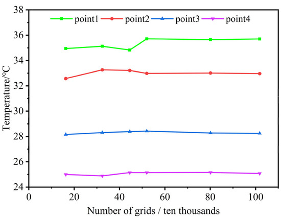 A suitable number of grids needs to be determined to ensure computational accuracy and improve computational efficiency. The grid numbers 163,000, 324,000, 445,000, 520,000, 801,000, and 1,018,000 were selected for analysis. The results are shown in Figure 3. After one hour of thermal energy storage under identical boundary conditions, the temperature values at the four monitoring points (Figure 1) were examined individually. Among the grid numbers tested, it was found that the grid number of 520,000 satisfies both the requirements for computational accuracy and speed.