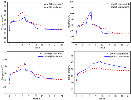 The surface of the external thermal energy storage layer was coated with an electric heating film, providing a constant heat flux of 300 W/m2. The duration of thermal energy storage was set to 7 h, while the release time spanned over 17 h. Figure 4 presents a comparison between experimental and simulated results regarding temperature measurements at the four monitoring points. There is only a slight deviation between the simulated values and the measured values, and the numerical results may reflect the variations observed in the measured data.