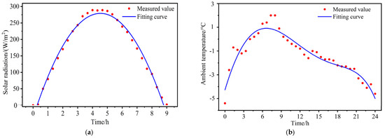 A fitted curve was generated to represent the measured radiation intensity values. Piecewise function fitting was employed to derive functional equations (Equation (12)) that described the fitting curve relationship between time and solar radiation intensity. When t < 0.43 or t > 8.7, the radiation intensity is 0 W/m2.