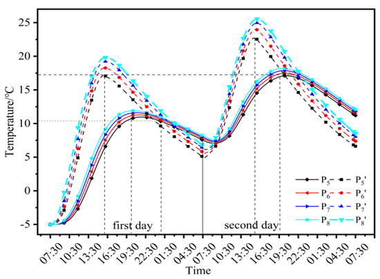 Figure 7 shows the indoor air temperature variation when the new PCM Trombe wall and the traditional Trombe wall were used. With the increase in radiation intensity and ambient temperature, the indoor temperature increased rapidly at an average rate of 3.06 °C/h when the traditional Trombe was used. The peak value of the indoor temperature was reached at 15:50. The indoor temperatures were 19.8 °C at the upper point P8′ and 17.1 °C at the lower point P5′. When the new PCM Trombe wall was used, the indoor temperature increased more slowly, at an average rate of 2.13 °C/h. The peak temperature was reached at 20:00. The indoor temperature at the upper point P8′ was 11.9 °C, and at the lower point P5 it was 10.9 °C. Compared with the traditional Trombe wall, it took approximately four additional hours for the new PCM Trombe wall to reach its peak indoor temperature. On the second day, the traditional Trombe wall exhibited maximum and minimum average indoor temperatures of 24.5 °C and 6.8 °C, respectively. In contrast, the new PCM Trombe wall demonstrated maximum and minimum indoor temperatures of 17.2 °C and 7.3 °C, respectively.