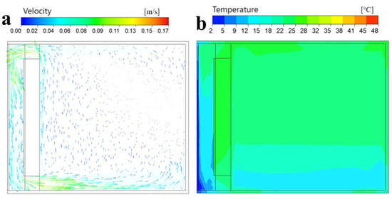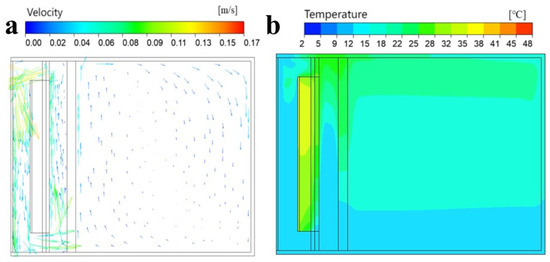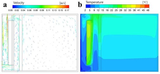 An analysis of the indoor air velocity was conducted on the second day. Figure 8 shows a velocity vector map and temperature cloud map for the traditional Trombe wall at 13:00 during the thermal storage stage. The airflow velocity of the traditional Trombe wall indoor space mainly depends on the temperature difference between the air layer and the indoor air. During thermal storage stage, there is minimal disparity between the air layer and indoor ambient temperatures, with a maximum velocity of 0.24 m/s observed at both the upper and lower vents.