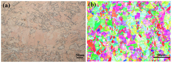The microstructures of pure copper: (a) metallographic structures; (b) inverse pole (IP) figures.