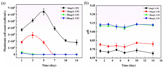 The change in planktonic SRB cell counts and pH values with different CPC concentrations during the 14-day incubation in the simulated oilfield-produced water: (a) planktonic SRB cell counts; (b) pH values.